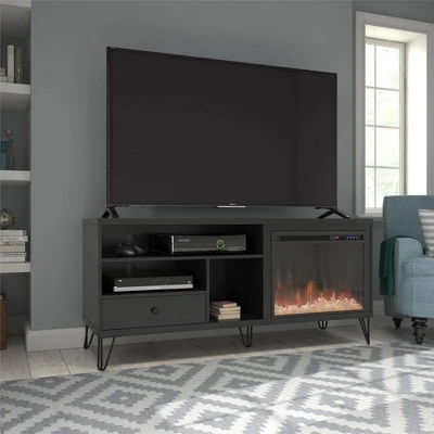 - Get a mid-century modern look with a fireplace bonus with the Room & Joy Heywood Fireplace TV Stand for TVs up to 65” wide or 120 lbs