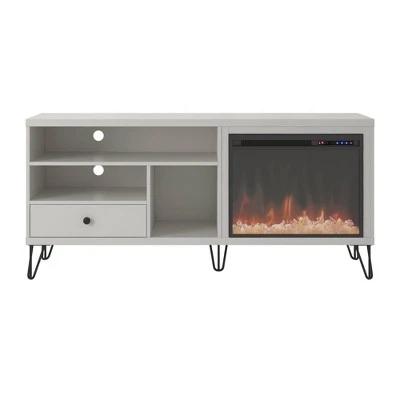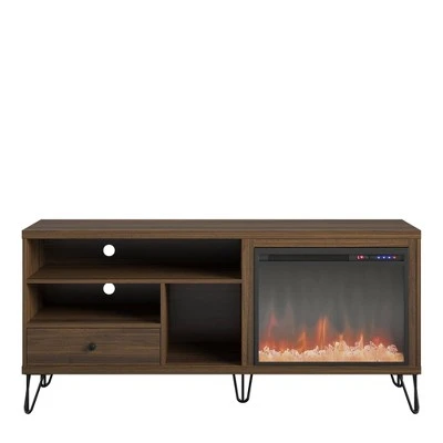 Add a mid-century modern flair to your living room or entertainment space with the Room & Joy Heywood Fireplace TV Stand. This stylish TV Stand can accommodate most TVs up to 65” wide or up to 120 lbs. The finish on the laminated MDF and particleboard pairs with the black metal hairpin feet for a trendy retro look. The 23” electric fireplace insert adds to the style with the realistic flame effect and crystal feature. The insert can be used with or without heat to enjoy the ambiance even in the summer. Control the various flame and heat settings with the remote control or touch panel. The insert plugs into a standard 120V outlet and heats a room up to 400 square feet. The 3 open shelves can hold your DVD or Blu-Ray player, audio equipment and gaming consoles. Wire management holes keep your cords tangle free and make plugging in devices simple. Store away remotes and manuals in the convenient drawer. The Fireplace TV Stand ships flat to your door and requires assembly upon opening. Two adults are recommended to assemble. Once assembled, the TV Stand measures to be 26.5”H x 59”W x 19.625”D.