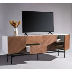 The tonal striations of this Daegan Mid Century TV Stand give your entertainment area the final finesse, ensuring your viewing parties are always the most stylish. Featuring two open drawers to easily store your devices or collection of Oscar winning films, the brass caps on Daegan’s subtle legs give this retro chic piece additional charismatic flair.