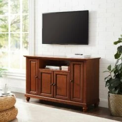 With the perfect fusion of function and style, this Alexandria TV Stand provides charm and plenty of storing options for your entertainment devices. Beautiful raised-panel doors strategically conceal various media paraphernalia, while adjustable shelving offers an abundance of versatility to effortlessly organize by design. Cord management systems help tame the unsightly mess of tangled wires. A warm hand-rubbed finish lends a contemporary look to this extraordinary piece of space-saving entertainment furniture.