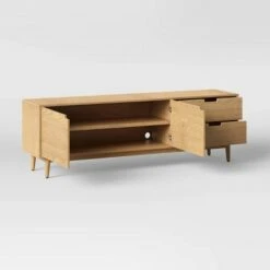Kick back and relax with your favorite movie when you add this Belmar Woven TV Stand from Project 62™ to your living room. Founded atop loop metal legs for better stability, this TV stand is crafted from durable wood and showcases a neutral solid finish that blends effortlessly with any decor style and color palette. This TV stand showcases shelf storage behind a traditional woven door to organize everything from movies and books to toys and more. Bring a whole new dimension to your entertainment space with this TV stand.