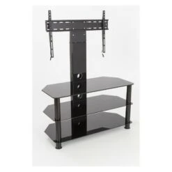 The FS1300VARBB-A (Varano) is a stylish, understated, ready to assemble TV Stand in sleek black on black. The top black tempered glass shelf supports a TV up to 110 lbs. (up to 65″), while the additional shelves support up to 22 lbs. each. The angled back corners allow for multiple positioning options, as it can be placed flat against a wall or into a corner of a room, providing ideal viewing angles for a larger area. The two lower shelves are perfect for AV components such as Digital Receivers, DVRs, Blu-ray, or Gaming Consoles. Installation is kept neat via the built-in cable management with entry and exit points along the length of the column so all power and connectivity wires can easily reach the equipment in an organized, tidy fashion. For most TVs in these sizes: 32, 37, 39, 40, 42, 43, 46, 47, 50, 52, 55, 58, 60, 65. Assembled dimensions: 51.8-inches (width) x 15.75-inches (depth) x 17.52-inches (height). IMPORTANT: For TVs with wide-spread feet, please measure the TV base to assure fit on this TV stand.