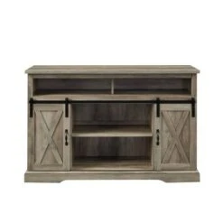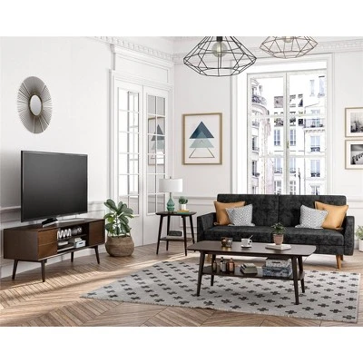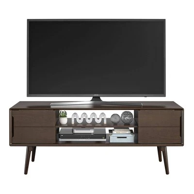 Give your living room or man cave a mid-century modern vibe with the Novogratz Brittany TV Stand for TVs up to 55ā wide or 95 lbs. Made with wood veneer with real wood legs, the beautiful finish pairs with the angled legs for a trendy look. The 2 center shelves can organize your DVD player, cable box, and audio equipment and feature wire cutouts so your cords stay tangle free.