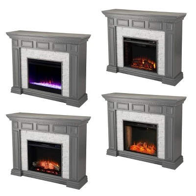 - Electric fireplace with faux stone accents