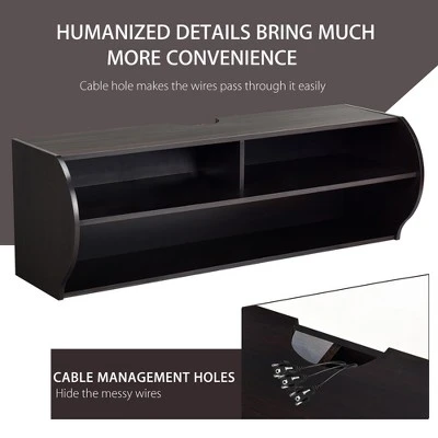 Our wall-mounted TV console will adds a touch of vanity and classiness to your home décor style. Designed with P2 standard MDF and engineered wood, our floating TV cabinet provides the heavy loading shelves to meet your daily storage needs. And the exquisite design cable hole offers a perfect wire management for all your items neat and organized. This contemporary wall-mounted TV shelf with creative design is perfect space-saving solution for your home and makes space utilization efficient.. Specification: Color: Dark Brown. Material: engineered wood. Overall Dimension: 48”x 16” x 16”(L x W x H) . Net Weight: 39.6 lbs. Weight Capacity: 120lbs tabletop. 50lbs each compartment. 80lbs bottom shelf. Package includes: . 1 x Wall-mounted TV Console.