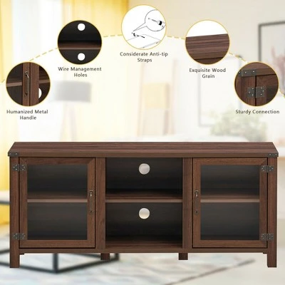 Our 57” TV stand is designed to upgrade the space of the entertainment center and add a touch of elegant and glamour to your living space!Crafted of high-quality engineered wood and 6 sturdy legs, this TV cabinet is stable and durable for long-term use. Spacious desktop will fit up to 65” TVs and some decorations. With adjustable design, 2-tier storage shelves and 2 large cabinet can not only offer plenty of space, but also meet the needs of items of different height. What’s more, the tempered glass doors is thick, visible and easy to keep clean. With clean line and exquisite appearance, it is suitable for your living room, bedroom, entryway, office and more. Specification: Color: Walnut. Material: P2 Engineered Wood. Overall Dimensions: 57” x 15.5” x 25” (L x W x H). Net Weight: 74.5 lbs. Weight Capacity: 250 lbs. Package includes:. 1 x TV Stand. 1 x Instruction.