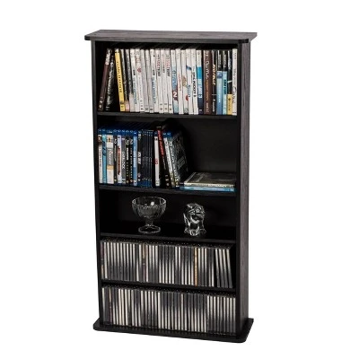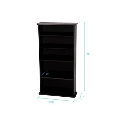 Classic design Drawbridge media storage unit by Atlantic will compliment all types of home decor! Multimedia unit designed specifically to hold all media types. Adjustable shelves offer endless customizing options for storage. Display decorative accessories in addition to media. Wide base provides structural integrity. Easy to assemble in an elegant black finish. Designed to accommodate up to 240 CDs or 108 DVDs or 132 Blu-Ray or 132 video games. There are 2 fixed shelves and 4 adjustable shelves for efficient organization.