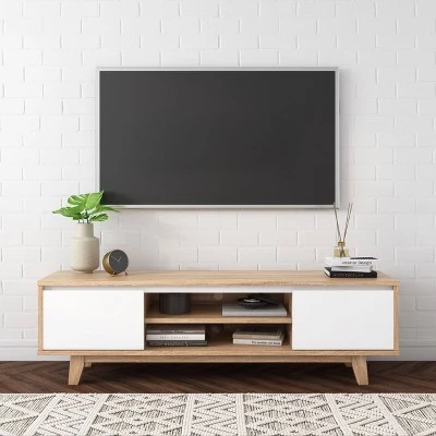 Take your living room to the next level with this stylish modern TV stand. Comprised of two contrasting cupboards, and an open shelf for a sleek yet classic appearance. This entertainment center creates additional storage space in your home for media, electronics, accessories, books, or decor. The beautiful wood finish with contrasting white doors paired with modern flared legs looks great in any aesthetic. This bench fits most TVs up to 68″ and is the perfect combo of classic colors and finishes.
