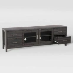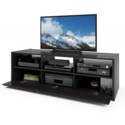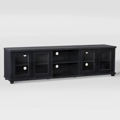 Elevate your entertaining space with this classic TV bench. A beautiful wood grain finish in a rich black, this bench is designed to accommodate all your storage needs. With enclosed shelving areas on both ends and adjustable shelves to fit any and all of your A/V equipment, gaming console and accessory heights. Sit back, relax and control all your equipment from the remote through the framed tempered safety glass doors. Keep your space tidy and organized with center open shelves and cable management openings in each storage area. A classic piece that will truly last a lifetime.