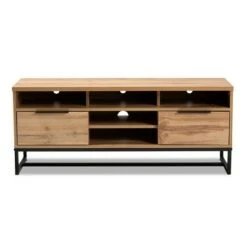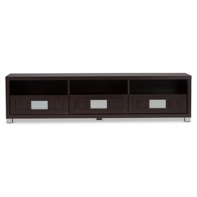 This sleek contemporary media console will be a sophisticated addition to your living room. The long low piece features clean lines, in a rich dark espresso finish that will complement your decor. The generous top surface will accommodate a large television up to 75 inches flat screen TVs , while open compartments below are ideal for electronics components. The large lower drawers and shelves offer lots of enclosed storage, great for movies, gaming equipment, and other media items that you want to keep hidden. The combination of MDF and frosted glass decoration accent the drawer front for a cool modern look that you will love. Create a chic look in your living room with this stylish contemporary TV stand.