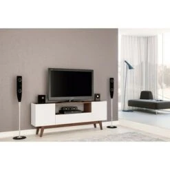 The Hampton TV stand is a perfect addition to any living room. With its touch of modern class and practical function, it will give your entertainment room a modern touch, but will also cover all your media storage needs. This TV stand is a perfect example of what a media console should be. With one door for larger items and a large drawer for storage, this TV stand is made to work and look good at the same time. Hampton can hold up to a 60-inch TV and all your entertainment apparatuses.