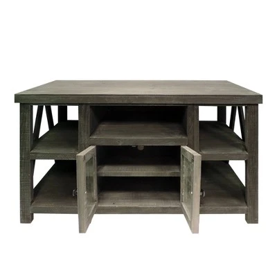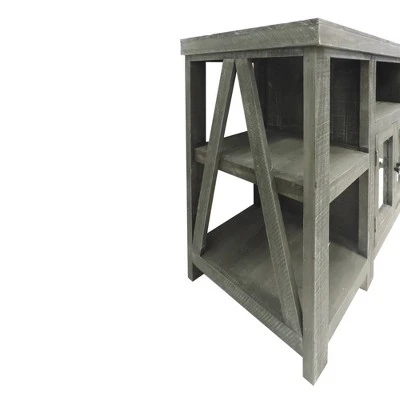 Bringing the best of design and function together, this rustic style TV console is a perfect addition to your home. Handcrafted from wood with distressed gray finish, this TV stand features an open compartment with cable cutout and two glass door cabinet with an interior shelving unit to keep your media accessories in an organized manner. The four side shelves with inverted V shape sides, offering display space. Due to the handcrafted nature of the product, there may be variation in color, finish, wood grain and knots.
