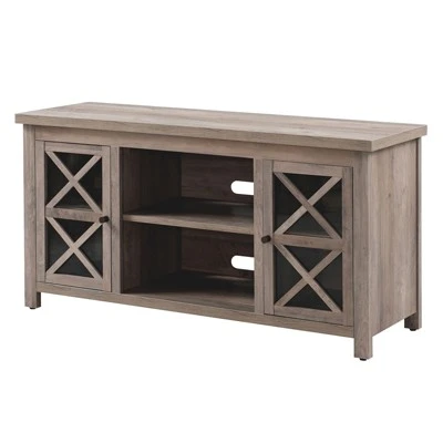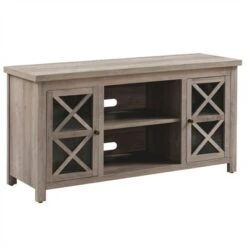 Combine functionality and on-trend design with this sturdy TV stand. Its rich wood tone creates a warm neutral palette that will blend seamlessly into any color scheme, while its crisscross-accented cabinet doors add a touch of modern farmhouse whimsy. A must-have for living areas and entertainment spaces, this TV stand sets the stage for the big game, a movie marathon, or that season finale everyone’s been talking about.Features : Accommodates TVs up to 55″.Finished in gray oak with black metal accents.The top has a weight capacity of 75 lbs. Lower shelves can hold 25 lbs. each.The two lower shelves feature an open center compartment and two side cabinets with swing-out doors.Features easy assembly.Specifications : Product Weight : 69.10 lbs