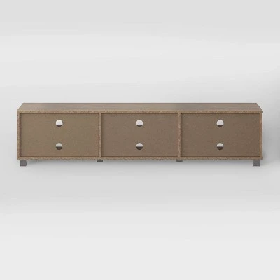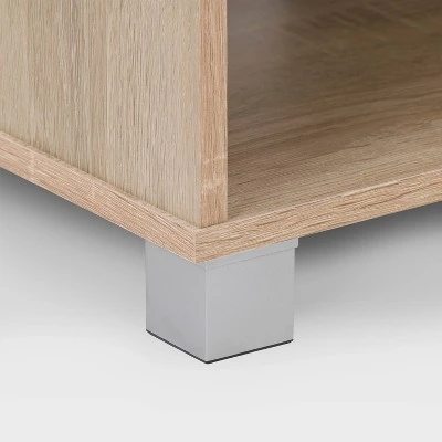 Take your living room to the next level with this stylish modern TV stand. Made with silver block legs, and open shelving for a sleek yet classic appearance. This entertainment center creates additional storage space in your home for media, electronics, accessories, books, or decor. The beautiful wood grain finish paired with silver pillar legs looks great in any aesthetic. This bench fits most TVs up to 85″ and is the perfect combo of classic colors and finishes.