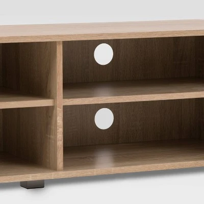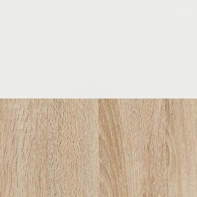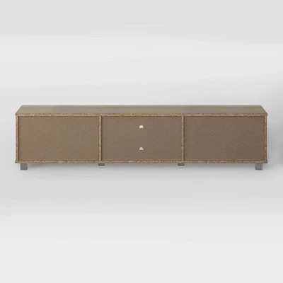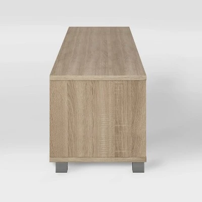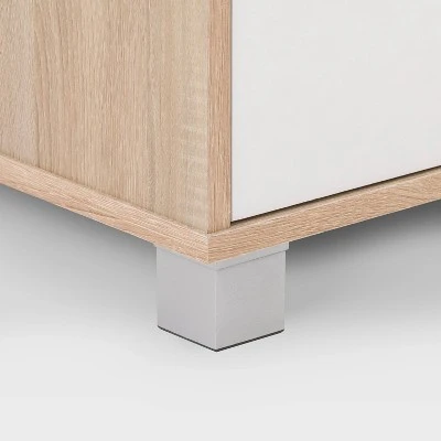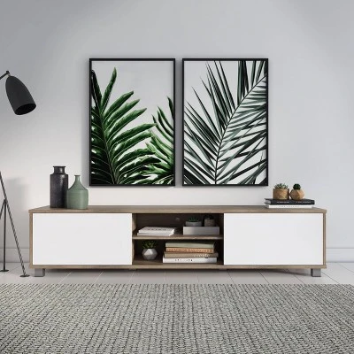 Take your living room to the next level with this stylish modern TV stand. Comprised of two contrasting cupboards, and open shelves for a sleek yet classic appearance. This entertainment center creates additional storage space in your home for media, electronics, accessories, books, or decor. The beautiful wood grain finish with contrasting white doors paired with silver pillar legs looks great in any aesthetic. This bench fits most TVs up to 85″ and is the perfect combo of classic colors and finishes.