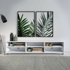 This classic staple item is featured in a rich black wood grain finish accented with imitation nickel handles and 4 cabinet drawers. Offering a variety of open and concealed storage options this TV bench is perfect for all of your A/V components and accessories and can accommodate most TVs up to 85″. Easy to assemble and will fit great in living rooms and entertainment spaces alike.