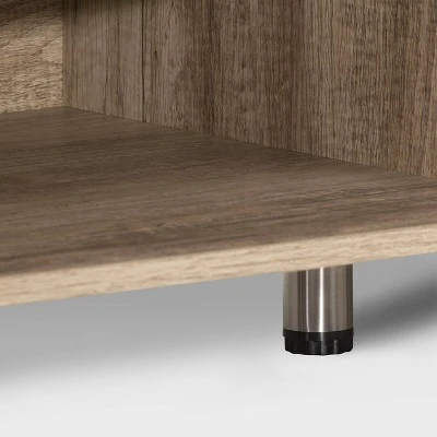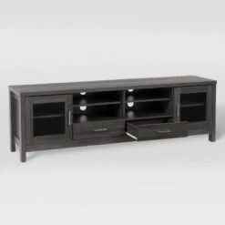 An sturdy and bold design paired with clean lines to complement any room’s décor. With shelving space for all your A/V equipment and accessories, the beautiful duotone cabinet doors with high quality powder coated aluminum handles enclose large storage space on both ends to keep it tidy and organized. Sturdy construction with adjustable center support legs, this bench the perfect design to hold TVs up to 90″. A great focal point in any living room or entertainment space.