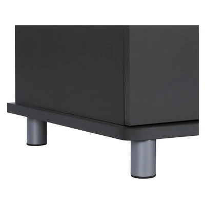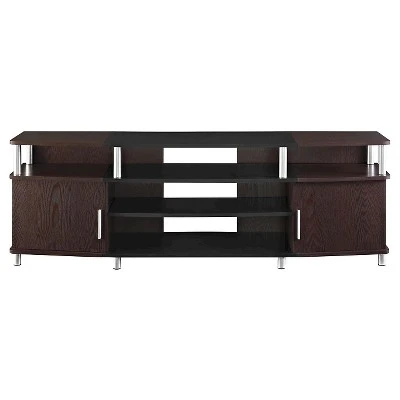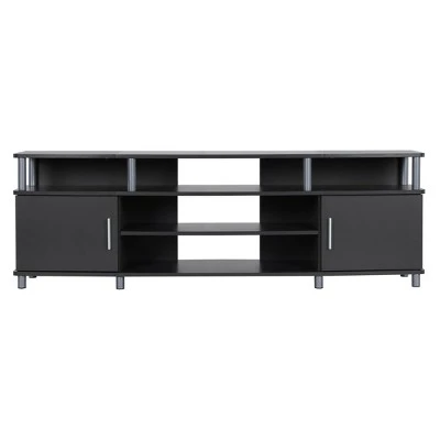 Elevate your entertainment space with the great-looking contemporary Room & Joy Kimmel TV Stand. Designed to accommodate up to a 70″ flat screen TV up to 120lbs., this TV Stand creates a sleek and stylish showcase for your home theater system. The TV Stand features multiple open shelves for numerous audio components. Two side cabinets provide additional concealed space for storing movies, music, video games, gaming controllers and other items. The Carson allows you to run wires easily and neatly through the large wire management holes in the back of the unit to keep all your components tangle free. The clean lines of this TV Stand and the matte black finish with silver metal accents makes this piece stand out in any room. After fully assembled, this stand is 20.5″H x 63″W x 15.75″D and is recommended to be assembled by 2 adults. This TV stand is constructed of particleboard and metal for a look that fits in with modern day style.