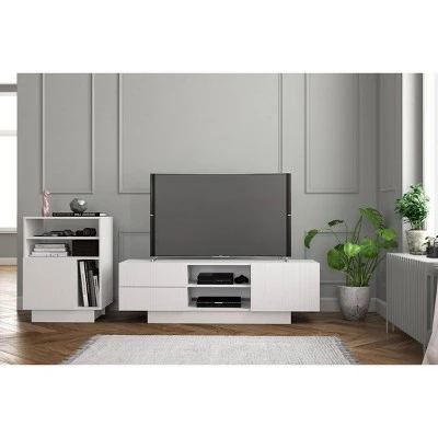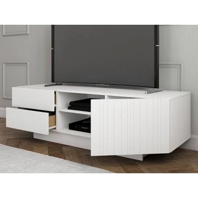 Ideal for movie marathon essentials or for your favorite potted plants, this TV stand with its modern yet cozy look is the perfect addition to your trendy & minimalist living room. This Marble collection 60” TV stand offers open shelf areas, 2 drawers and a door with additionnal storage space. The door panels have a modern twist with a linear construction detail that brings timeless depth and texture in a matte white lacquer finish.