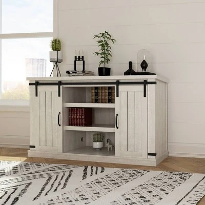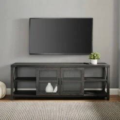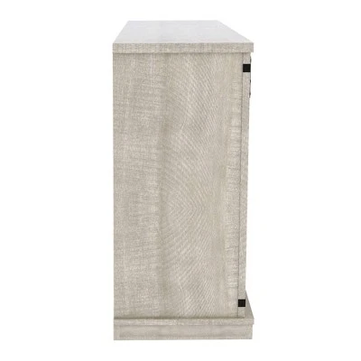 Bring your entertainment room together with a sturdy media console in a charming dusty gray oak finish that will add some farmhouse style to your space. Designed with ample storage in mind for all your favorite movies and shows, as well as a handy cord management system that makes this piece an ideal choice. This console is excellent in a hallway, with a convenient surface to display your favorite items and to provide some extra storage.