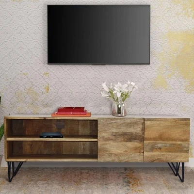 A TV Stand which is promising, trendy and space saving too. This lovely TV stand is made up of metal and mango wood. It features a nice smooth natural finish on the top and has black finish metal legs which makes this unit durable. A perfect addition to your living space or bedroom as it will enhance the whole look in an organized manner.
