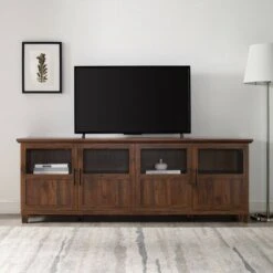 Kimber 4 Door Glass Panel Storage TV Stand for TVs up to 80″ – Saracina Home Dark Walnut