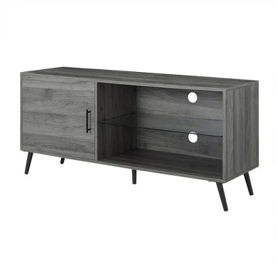 A perfect blend of materials, this 52-in TV storage console is the asymmetrical design that will set your home apart. Crafted of high-grade MDF, tempered safety glass, with a mid-century modern vibe, the open and closed storage is an excellent way to organize and display your electronics and decor. Choose from an elegant dark walnut or warm pecan to highlight any room in your home.