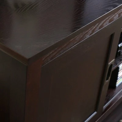 The epitome of transitional design, this seventy-inch TV console from Saracina Home looks superb with a variety of room styles. Plus, the amount of storage it provides is almost unbelievable. There are two fixed shelves on each of the bookend sections of this transitional entertainment center. Two sliding doors with indented metal handles can be placed to cover up those portions or meet in the middle to hide the center section so you get to choose what part is considered open storage and what part is closed off. The middle of the media stand also has two fixed shelves as well as two low cubbyholes. Each area of this TV stand has cord management options so you can set up and organize your gaming consoles and smart home devices with ease. This media stand can accommodate TVs up to 78-inches.