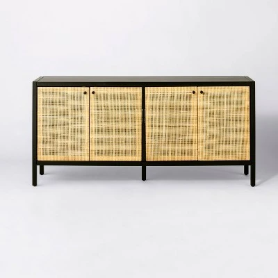The Springville Caned-Door TV Stand from Threshold⢠designed with Studio McGee updates your gathering space with just the right amount of understated style and intriguing texture. This beautiful entertainment console comes in solid black and features a clean-line silhouette with straight legs and a rectangular top, but the real appeal comes from two pairs of cane-front cabinet doors in a lovely natural shade and finished with small black pulls. The wood frame offers stability you can count on, while internal shelving lets you keep things organized while still keeping odds and ends out of sight. Simply style as is for a tidy support piece for your TV, or complement the stand’s simple style with an arrangement of decorative accents for a more integrated approach.