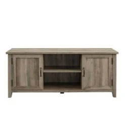 The Touraco TV Stand from Opalhouse⢠lets you store and display your belongings in one cool, convenient design. Featuring a durable hardwood frame in a charming brown finish, this media stand has a smooth rectangular tabletop to hold your 55-inch flat-screen TV in place. It has two open shelves and cutouts at the back for keeping cords and cables organized, and is flanked by side cupboards to offer you plenty of displayed and hidden storage. Each side cupboard is designed with an artistic geometric-paneled and striped door in white to offer a striking contrast to the brown frame. Plus, this decorative stand is equally practical as a chic kitchen buffet or decorative display case in your home.