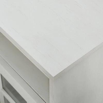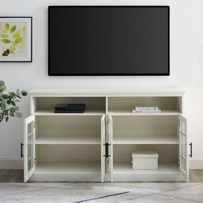 Take a look inside this 58″ Transitional 4-Door Windowpane TV Stand by Saracina Home. The timeless console boasts two sets of double doors with tempered safety glass windowpane fronts to frame your impressive collection of movies and media components. Two adjustable shelves and cord management ports ensure that the unit will remain peerlessly organized. If you see yourself using this unit as a sophisticated buffet in the kitchen, you can nestle your finest place settings in the tall design’s two upper shelves.