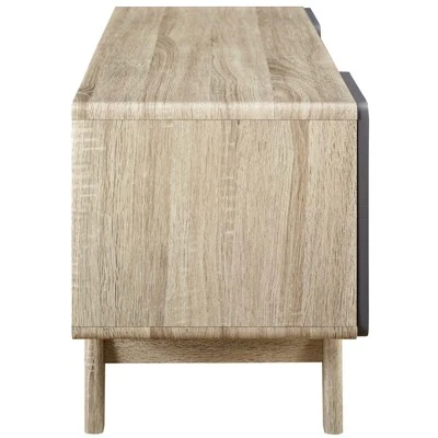 Activate the charismatic style of mid-century modern with the Tread 59″ TV Stand. Featuring a linear silhouette with rounded corners, Tread comes with a height adjustable center media storage shelf, durable fiberboard construction, and extra support legs for added sturdiness. Available in either walnut grain veneer with hinged white side doors or natural grain veneer with gray side doors, Tread has a look perfect for your contemporary living room decor. Complete with center cable management for all your entertainment needs, Tread is a versatile contemporary TV stand with ample concealed and open storage. Accommodates flat screen TVs up to 65 inches.