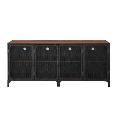 Integrate this 60-inch industrial TV stand into your home for additional storage space. In a stylish, rustic industrial aesthetic featuring mesh metal cabinets and in a durable laminate construction showcasing a wood grain finish. Providing three storage cabinets with adjustable shelves to organize anything from extra kitchenware to media and electronics. Set up in your entryway as a large entryway table with a canvas on the table top and vases filled with flowers, or as a storage cabinet in your bedroom for bins full of accessories from scarves to jewelry, or as a buffet in your kitchen. If used as a TV stand in your living room, it can support up to a 66-inch TV.