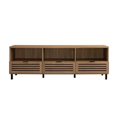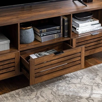 Design your living space with this entertainment center from Saracina Home. With a symmetrical design of high-grade MDF, laminate, and metal legs. With decorative slat doors on the bottom and open shelving on top for organizing your books, media, and decor. Side cabinets open up with the center drawer for storing DVDs, CDs, and video games. Decorate the table top and open shelving with vases, plants, and other décor. This TV stand can support up to a 78-inch TV. Enjoy family movie night with this storage console in your living room. Can also add storage space to your bedroom or home office. In a transitional and modern design to complement your space.