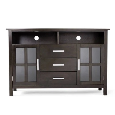- Features tempered glass doors that open to cabinets with one (1) adjustable shelf each, three central drawers with metal drawer glides and open top space for media devices.