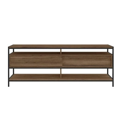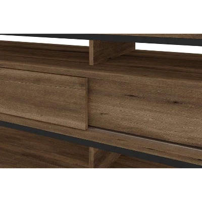Provide a sophisticated abode to all your media gadgets by bringing in this contemporary style TV Media Console Stand which offers spacious storage with its 2 drawers and open compartments. Constructed from the combination of particle board and metal, this entertainment center for your flat screen TVs is accented with brown and black finish.