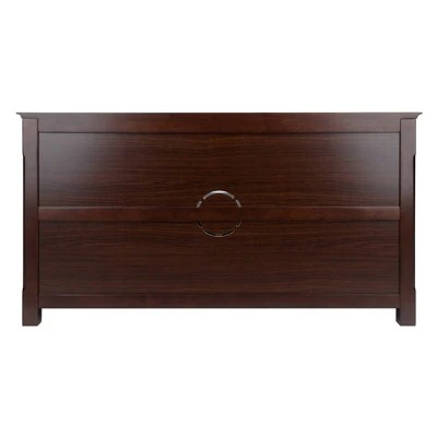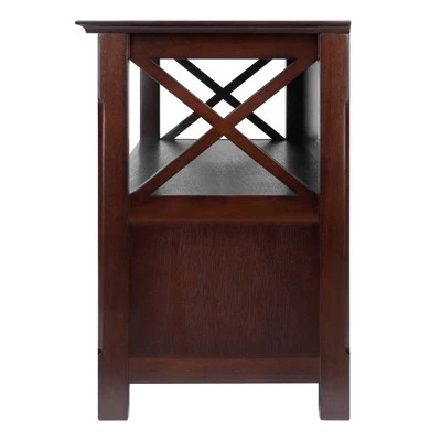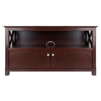 The Xola TV Stand from Winsome offers a stylish way to display your TV and store your entertainment equipment. Fusing fashion with function, this wood-finish TV stand can accommodate up to a 40-inch flat screen TV on its sleek table top with beveled edges, while the lower open shelf is great for keeping DVDs, media players and more. The two closed cabinets offer additional space for keeping some items hidden, and the chrome-finish pulls on the doors lend an eye-catching contrast with easy opening and closing convenience.